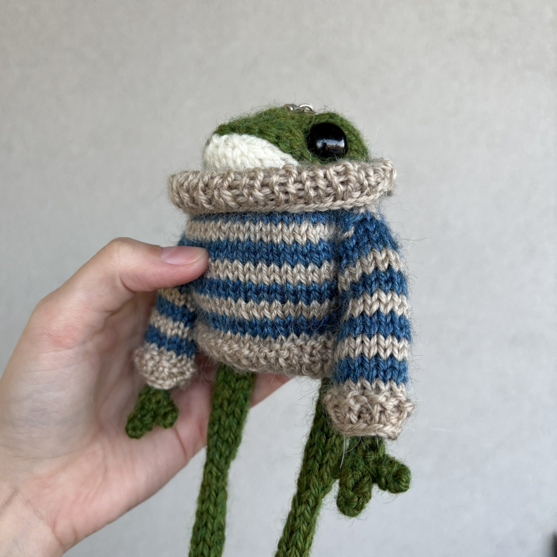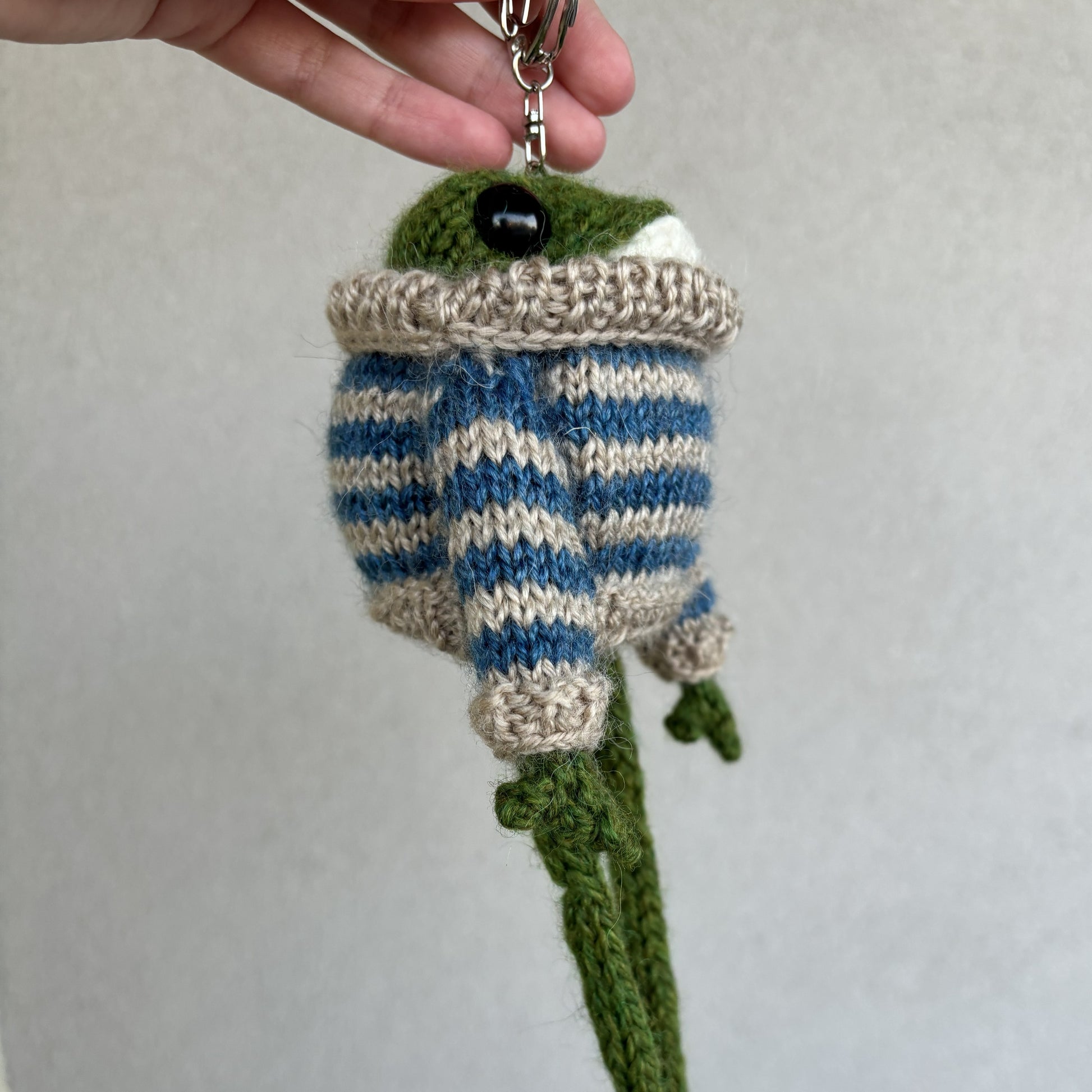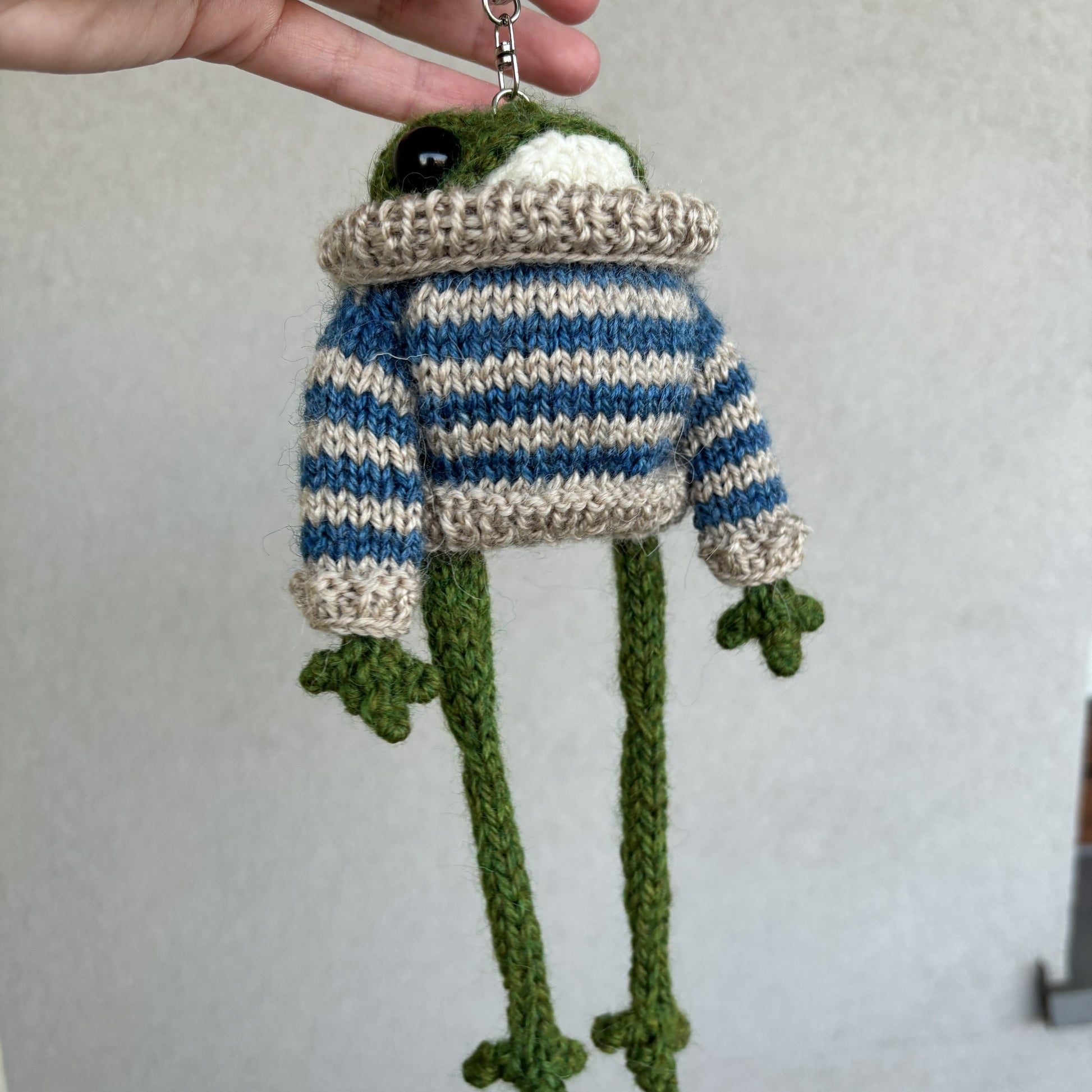 Breloczek Żabka w swetrze beżowo-błękitnym