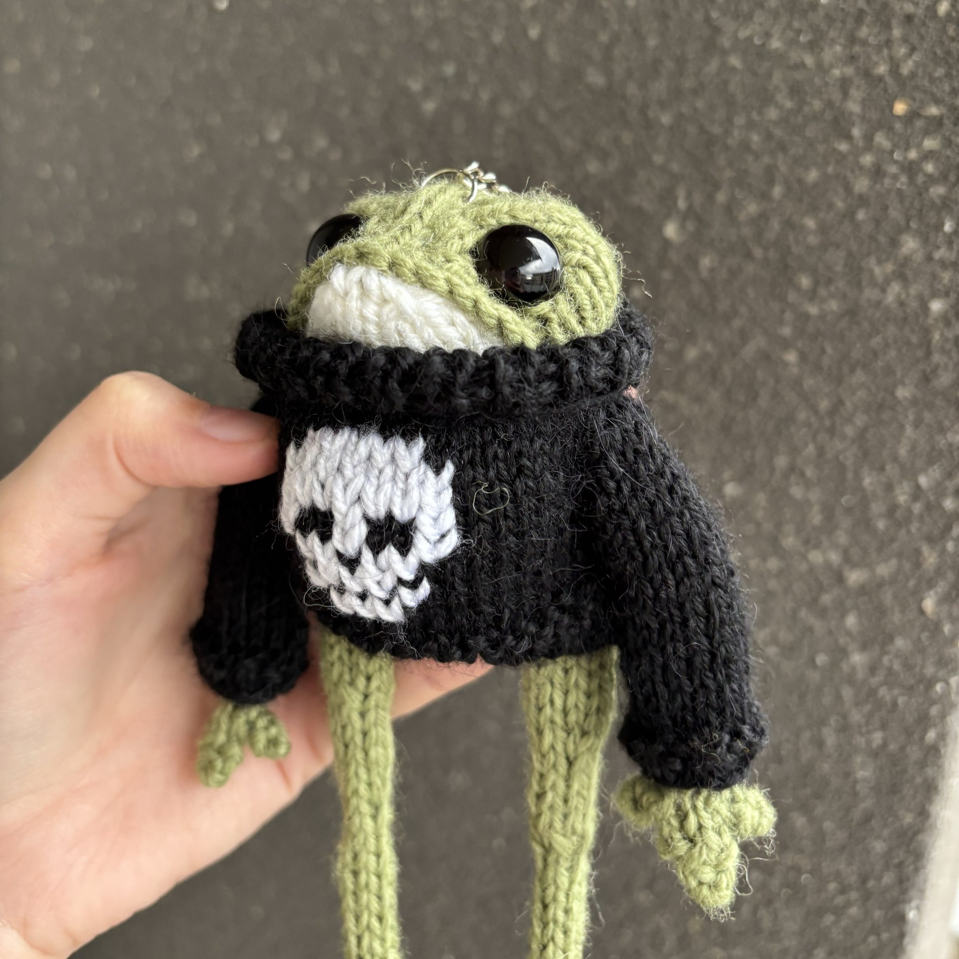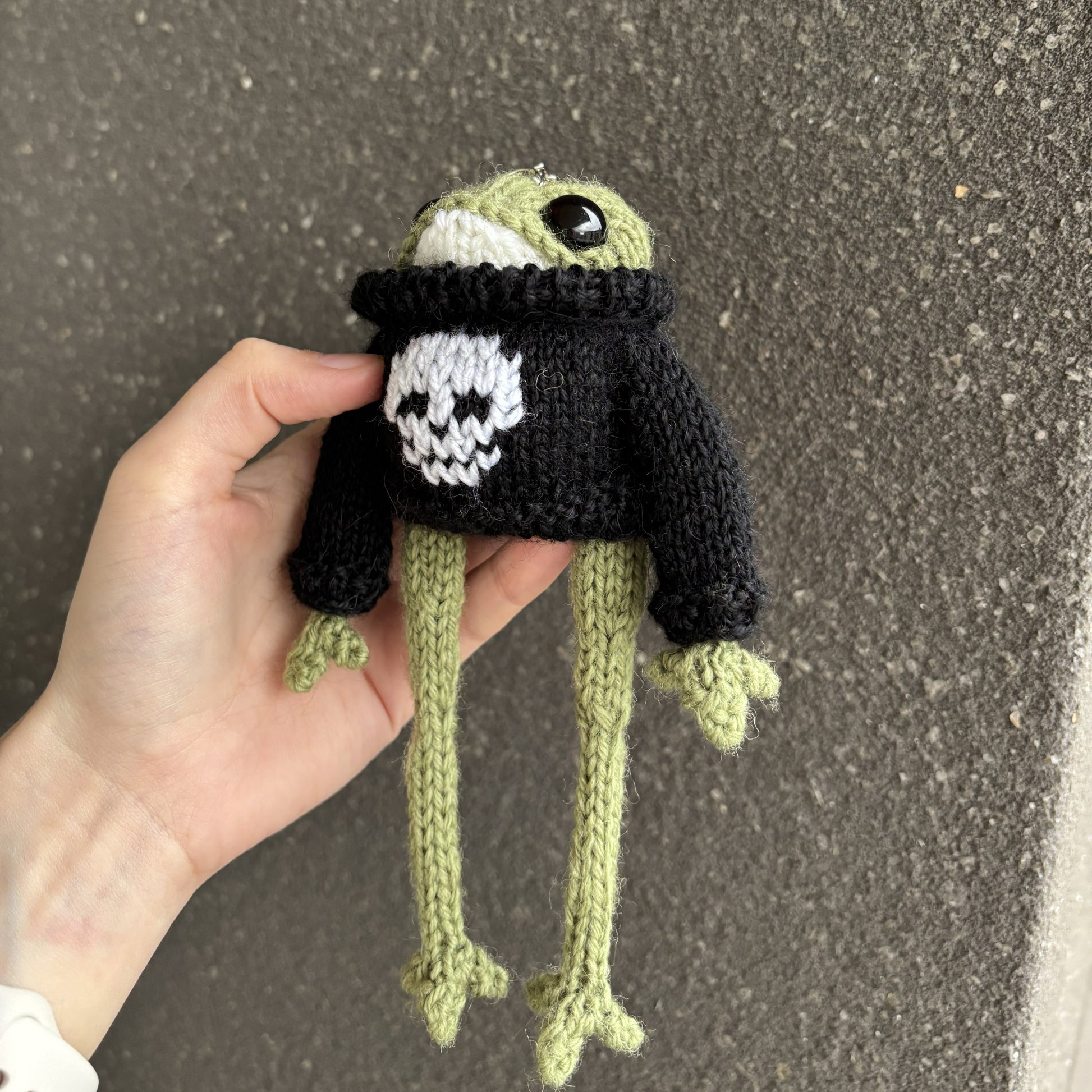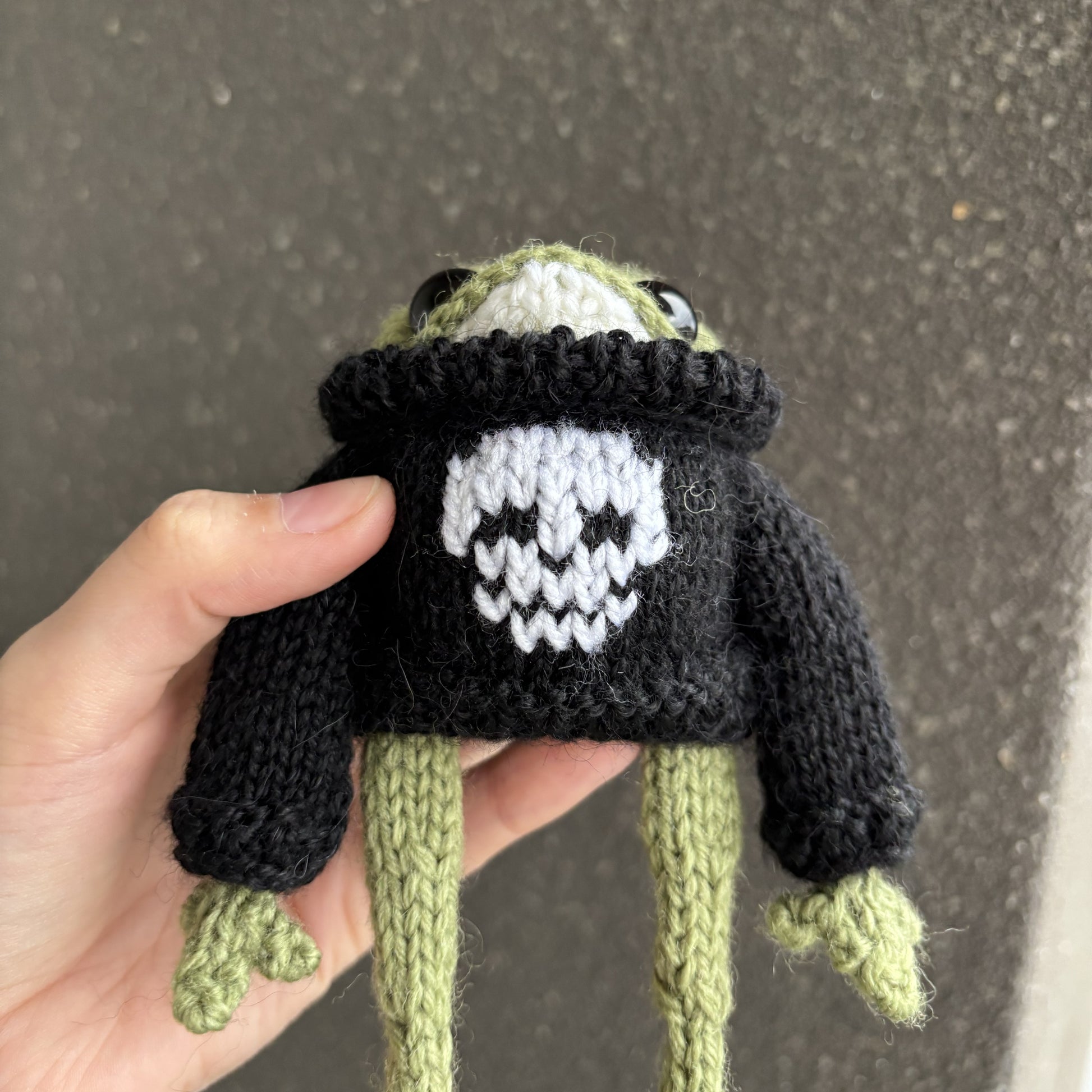 Maskotka wykonana ręcznie na drutach. Ręce i nogi można ustawić w dowolny sposób (w środku drut aluminiowy). Sweter zdejmowany.