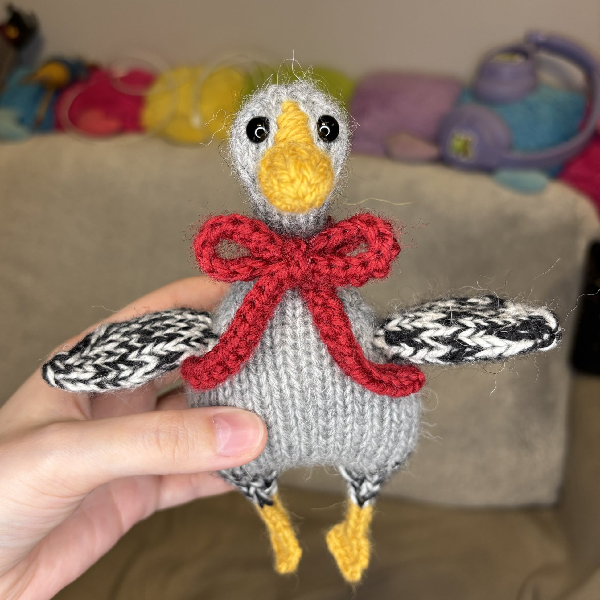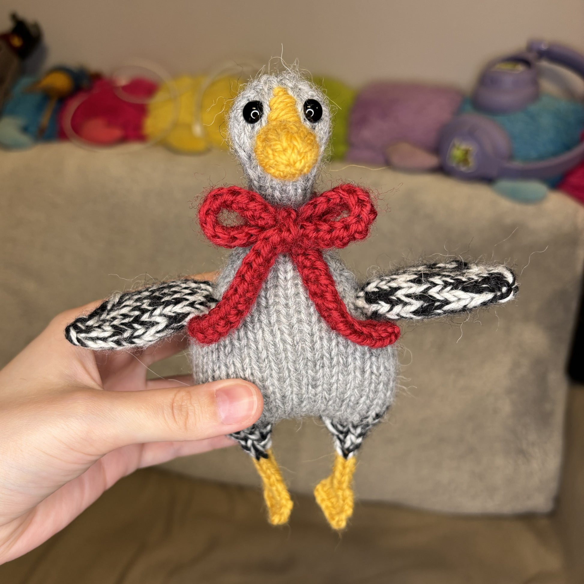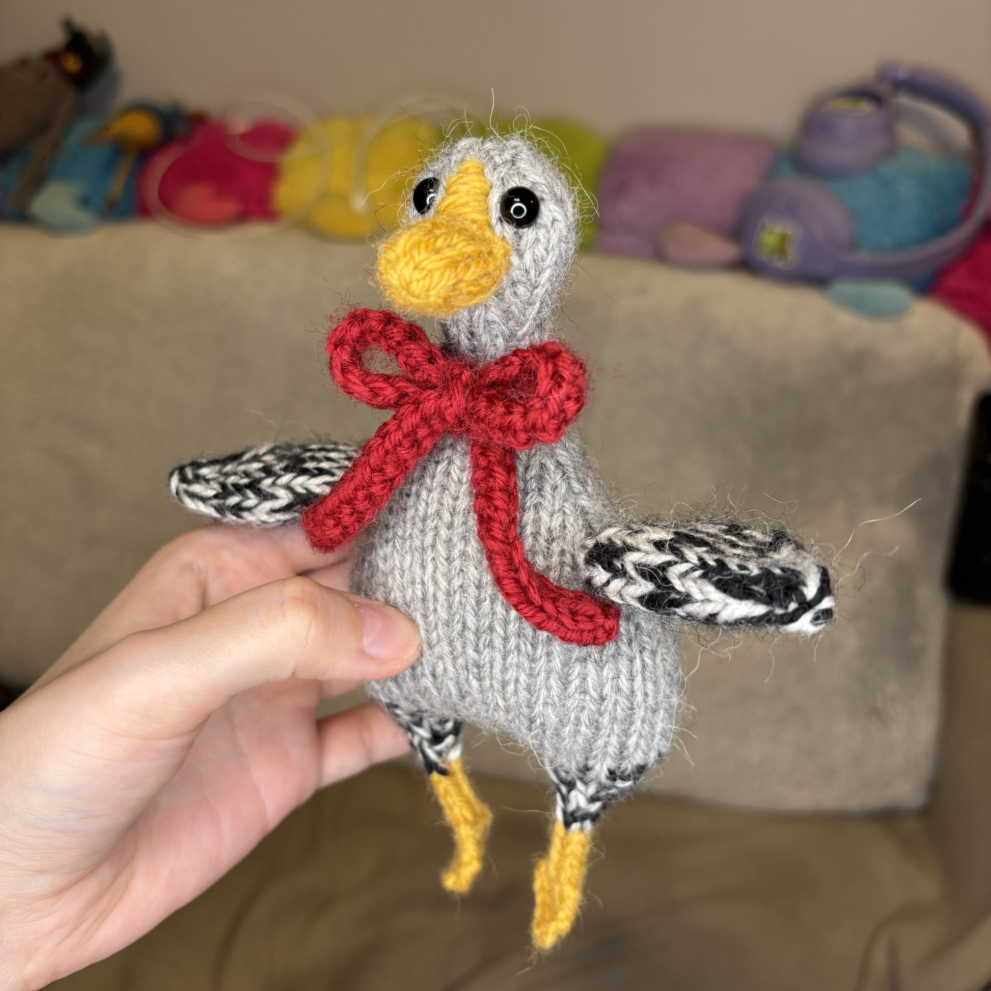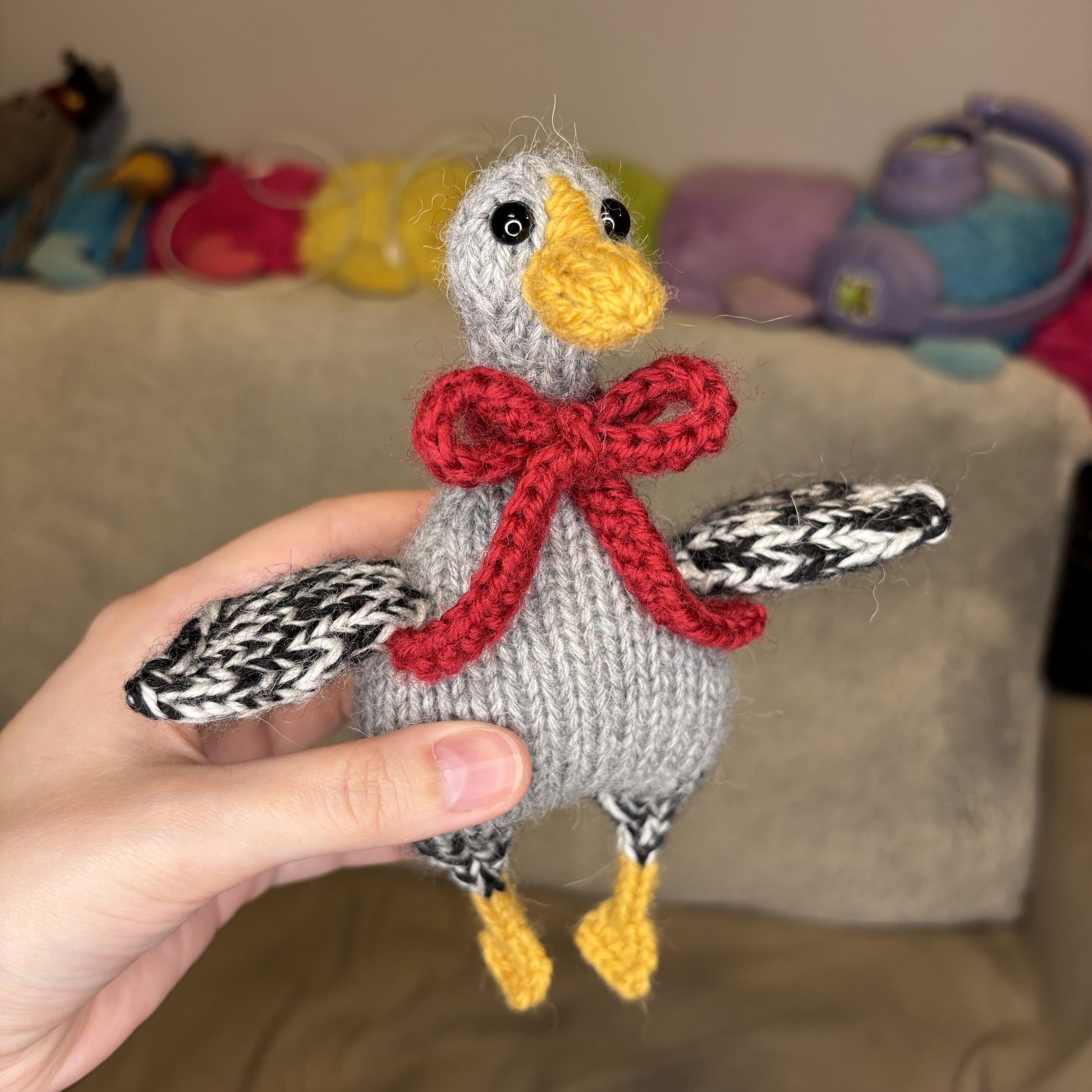 Maskotka wykonana ręcznie na drutach. Kokardka zdejmowana.