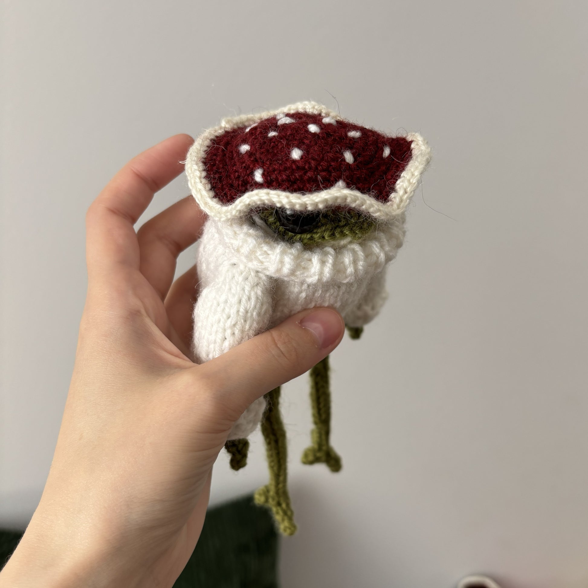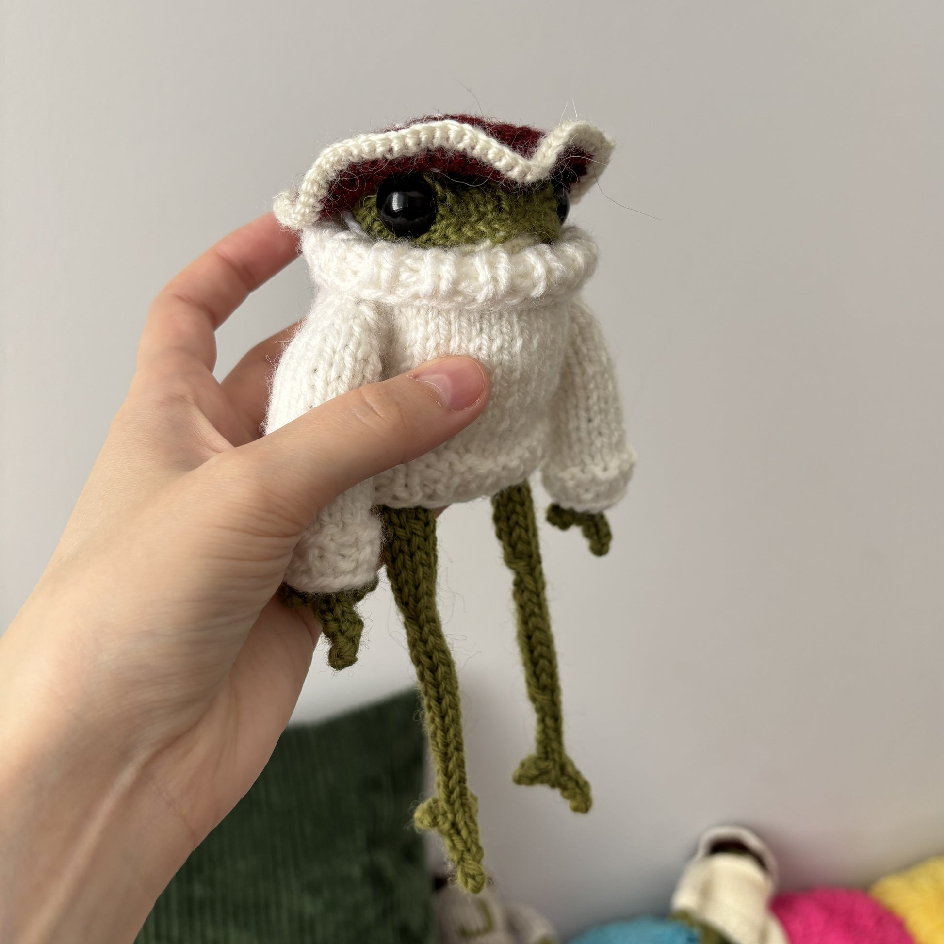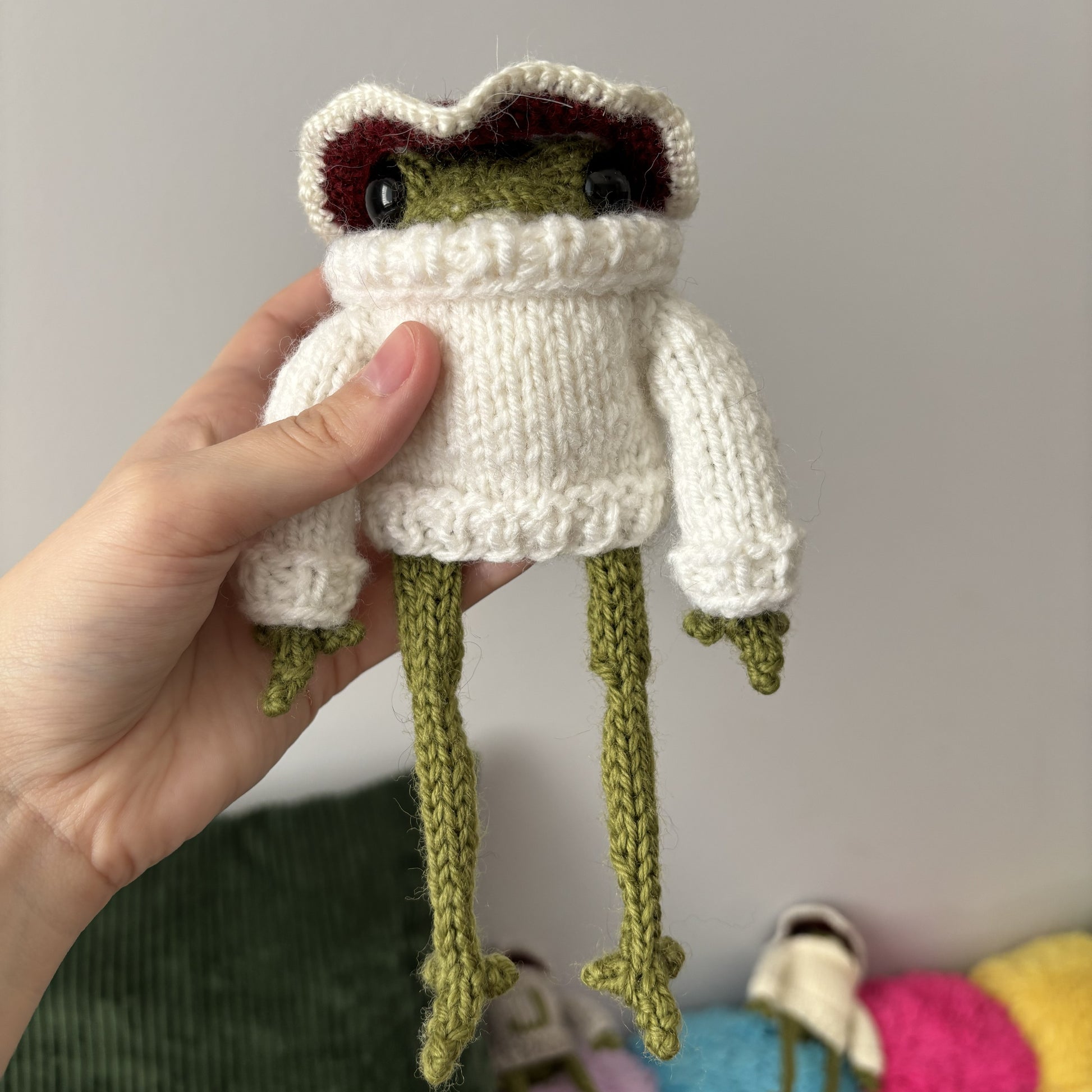 Maskotka wykonana ręcznie na drutach. Ręce i nogi można ustawić w dowolny sposób (w środku drut aluminiowy). Sweter i kapelusz zdejmowane.