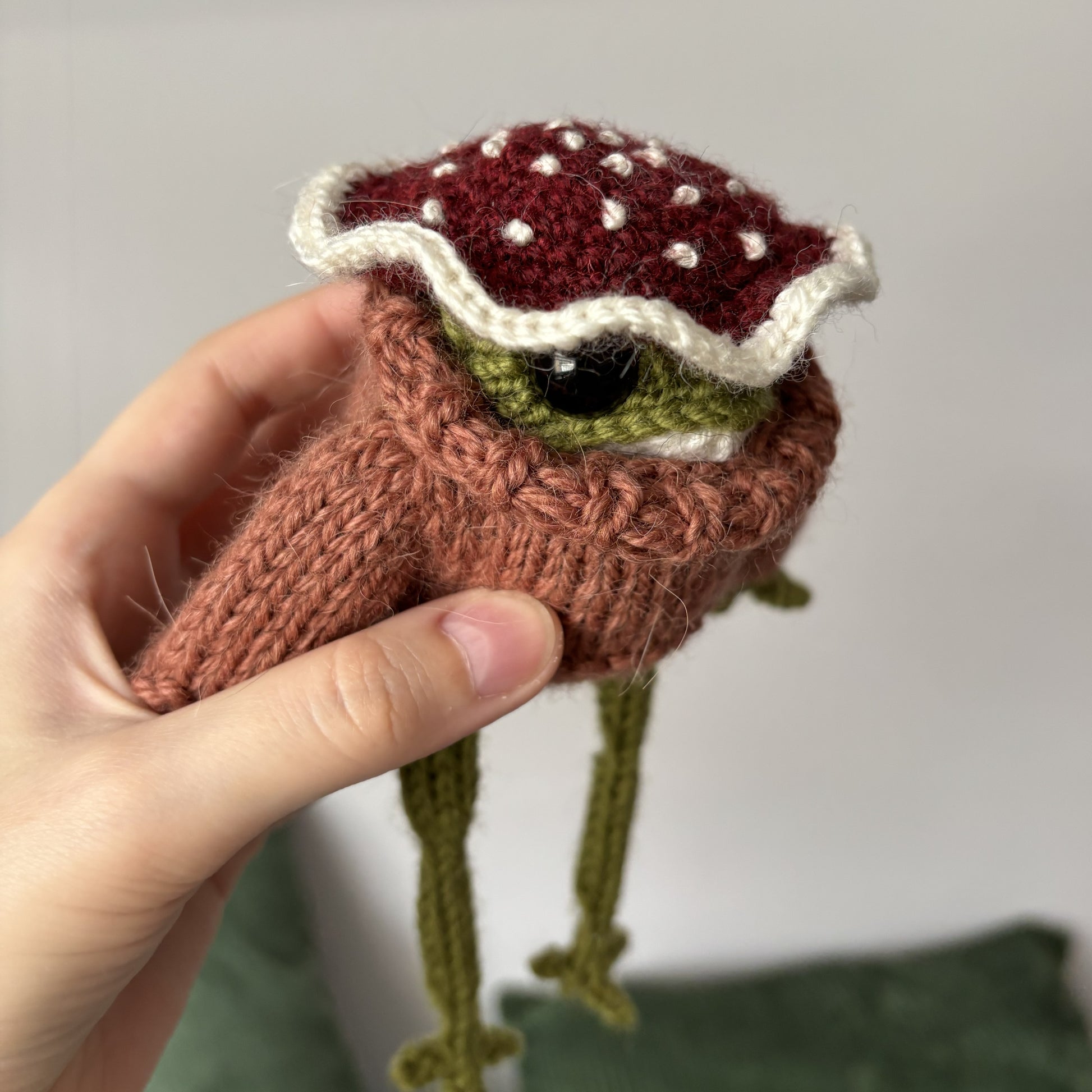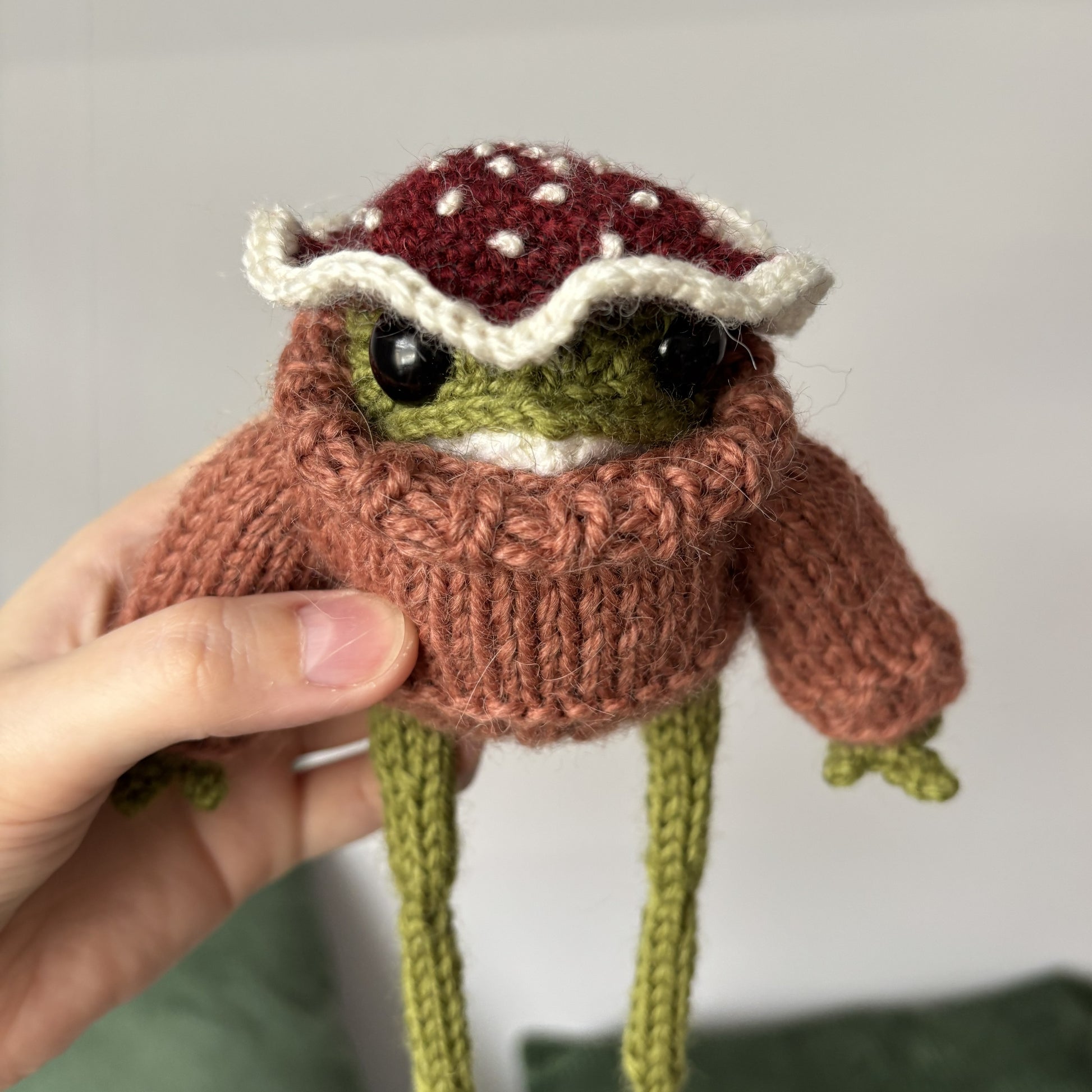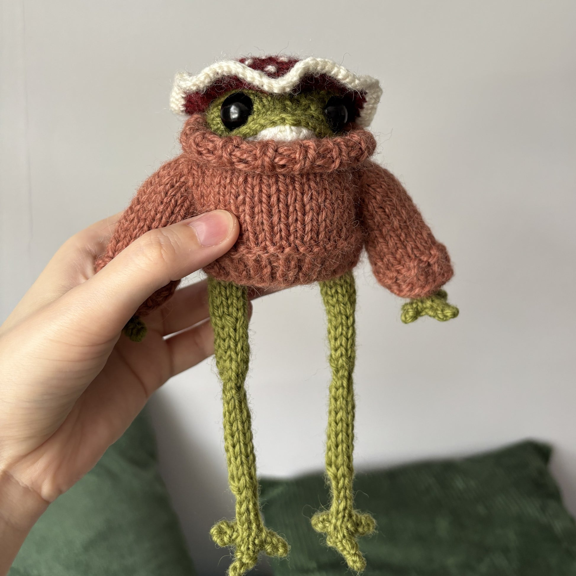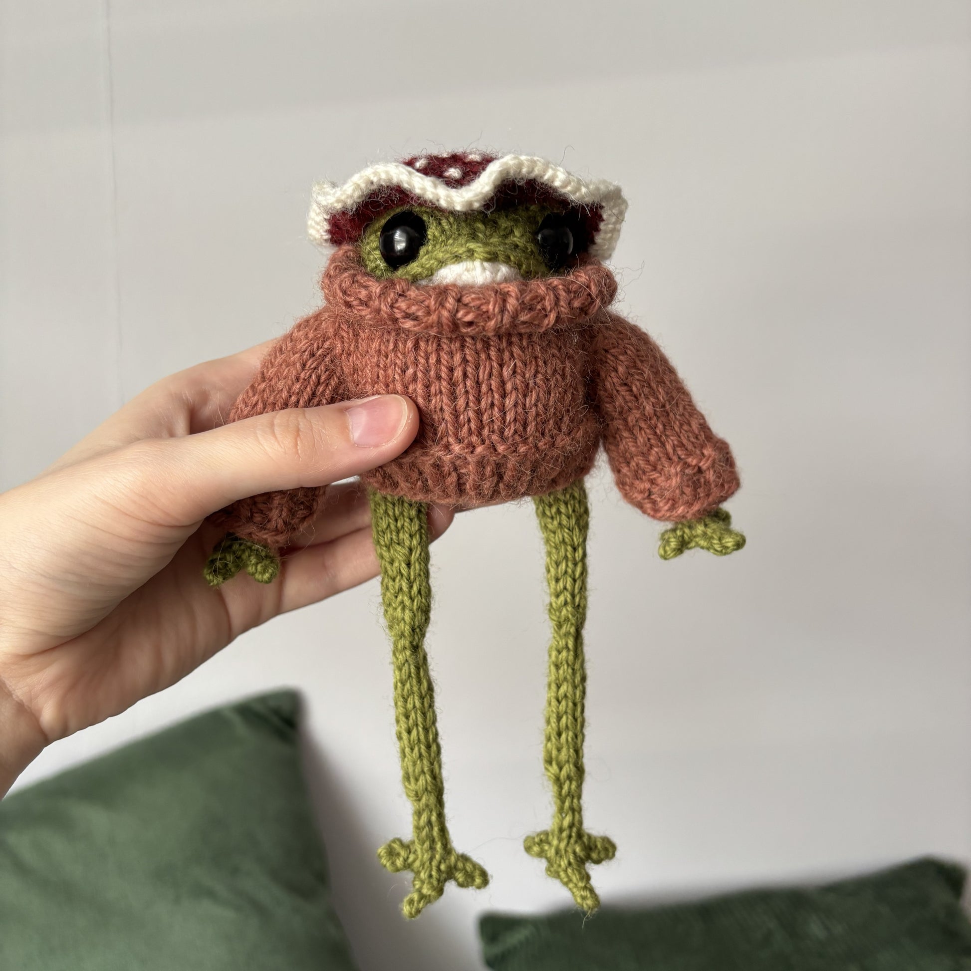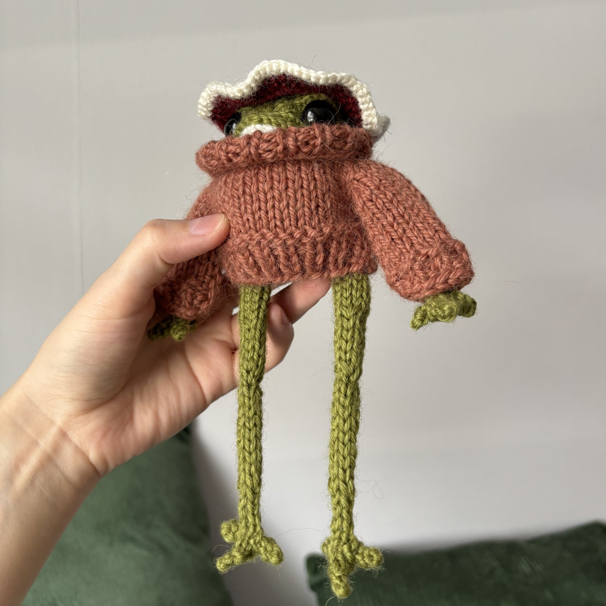Maskotka wykonana ręcznie na drutach. Ręce i nogi można ustawić w dowolny sposób (w środku drut aluminiowy). Sweter i kapelusz zdejmowane.