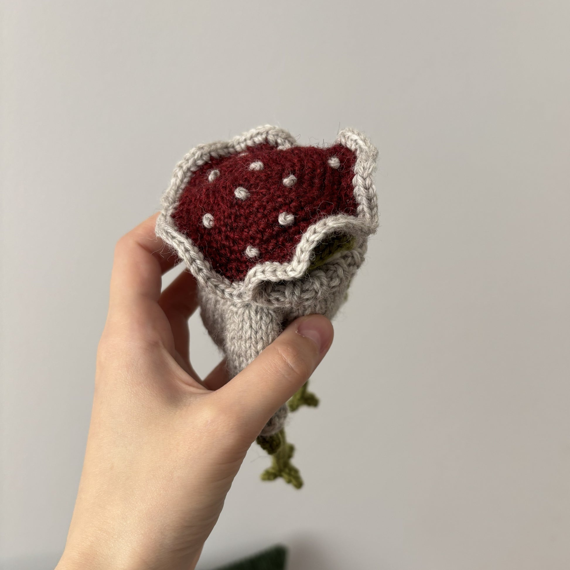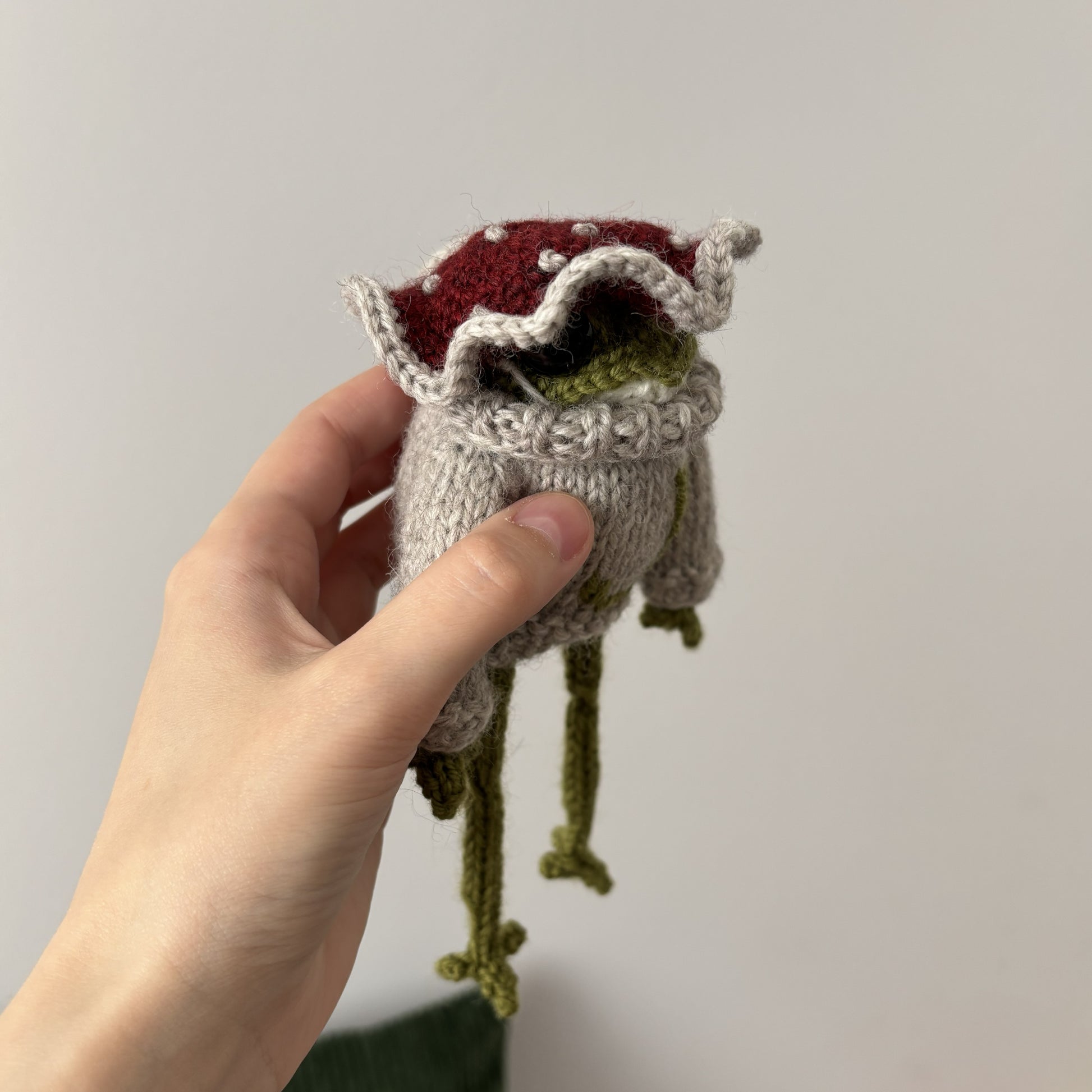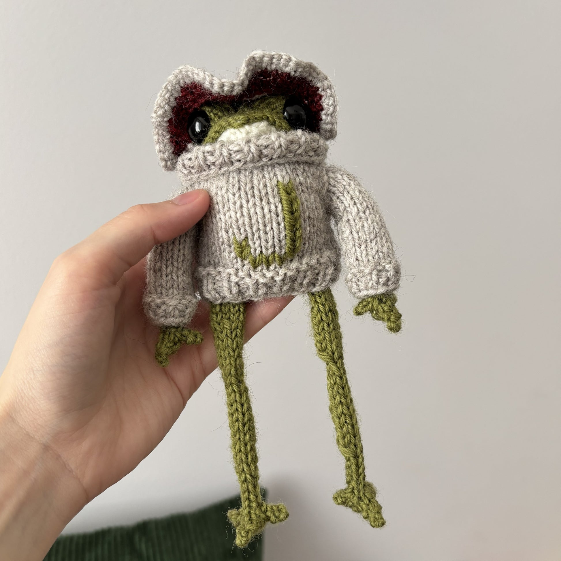 Maskotka wykonana ręcznie na drutach. Ręce i nogi można ustawić w dowolny sposób (w środku drut aluminiowy). Sweter i kapelusz zdejmowane.
