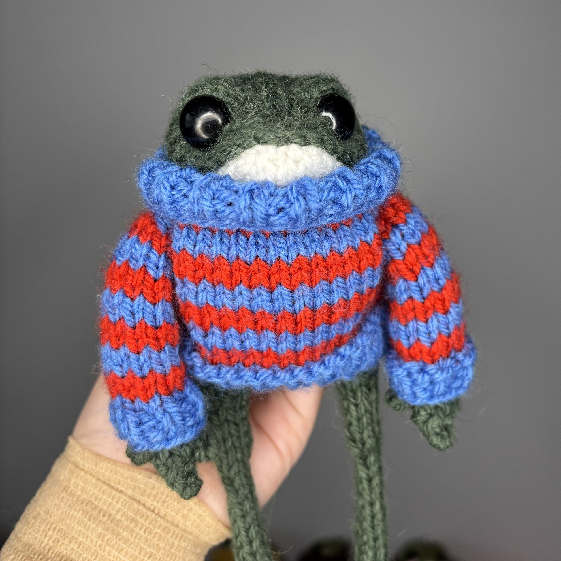 Maskotka wykonana ręcznie na drutach. Ręce i nogi można ustawić w dowolny sposób (w środku drut aluminiowy). Sweter zdejmowany.