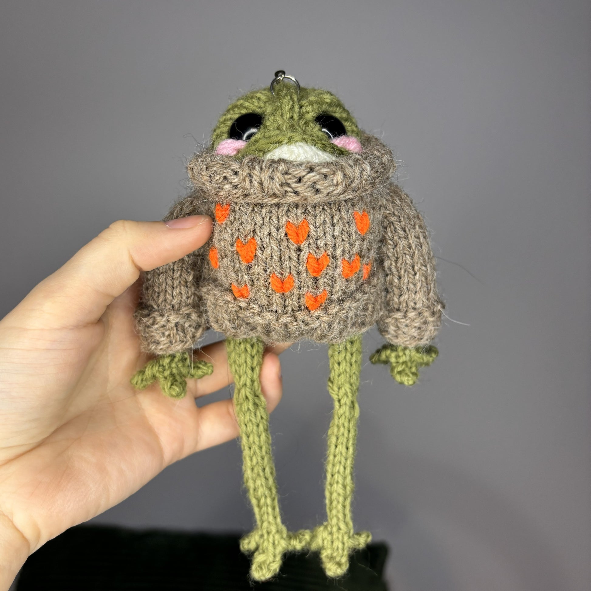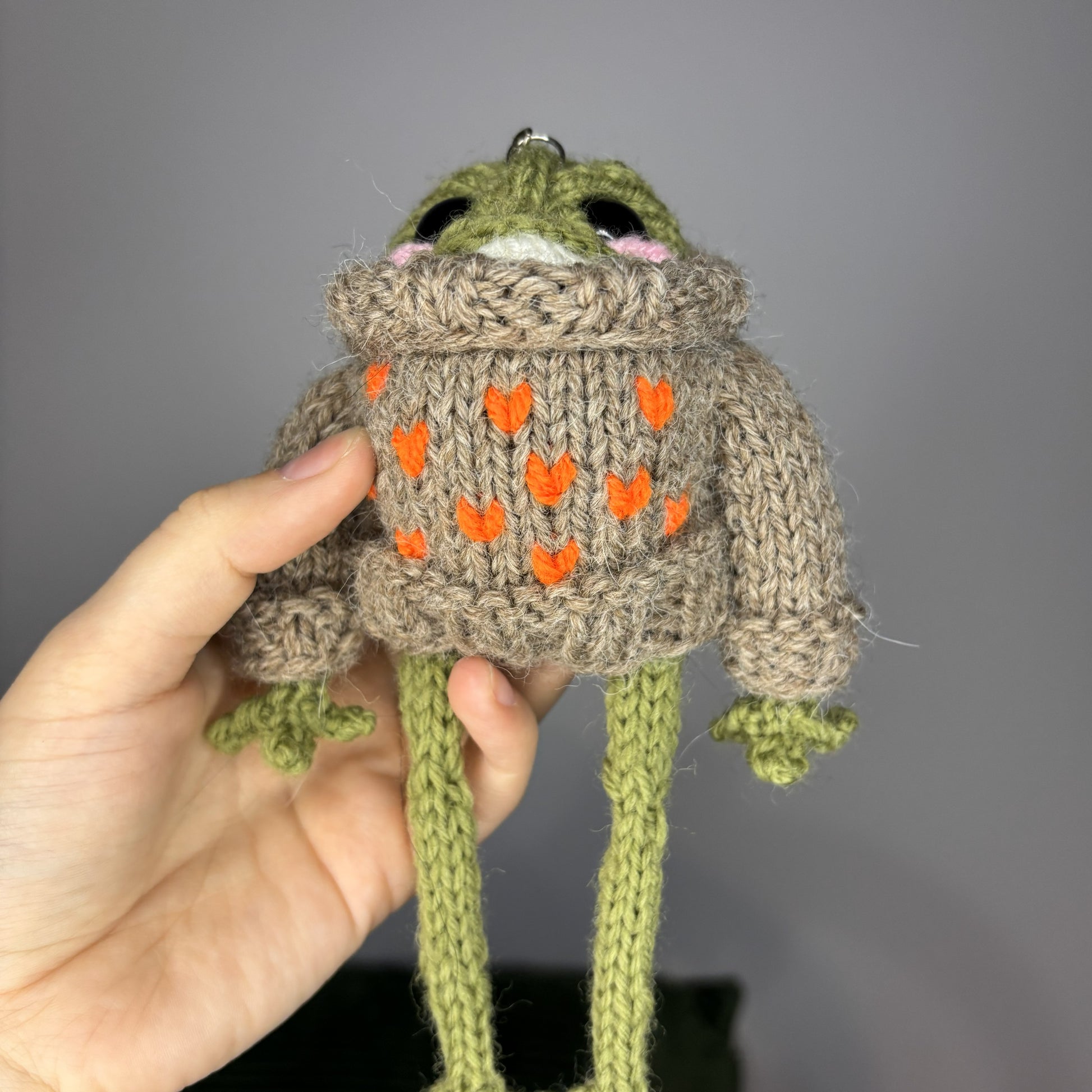 Maskotka wykonana ręcznie na drutach. Ręce i nogi można ustawić w dowolny sposób (w środku drut aluminiowy). Sweter zdejmowany.